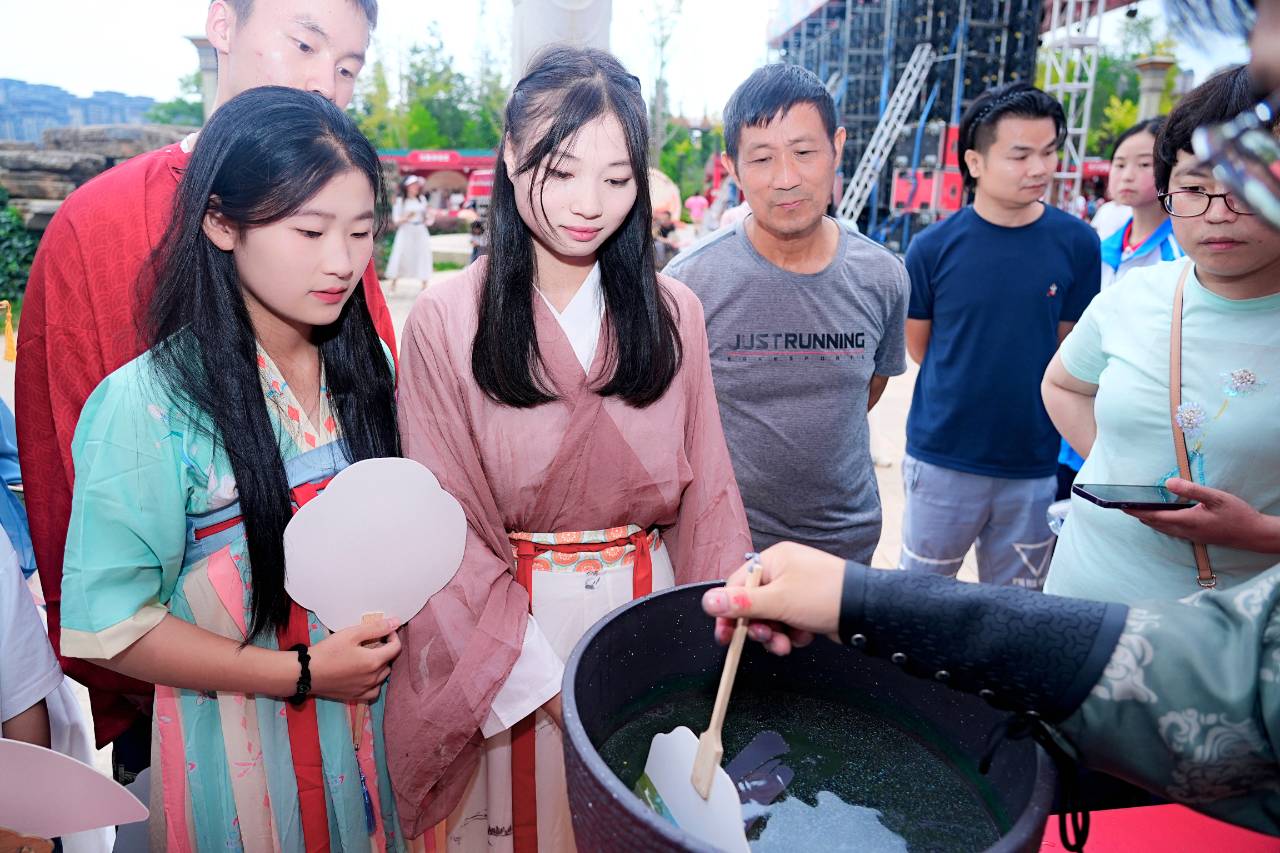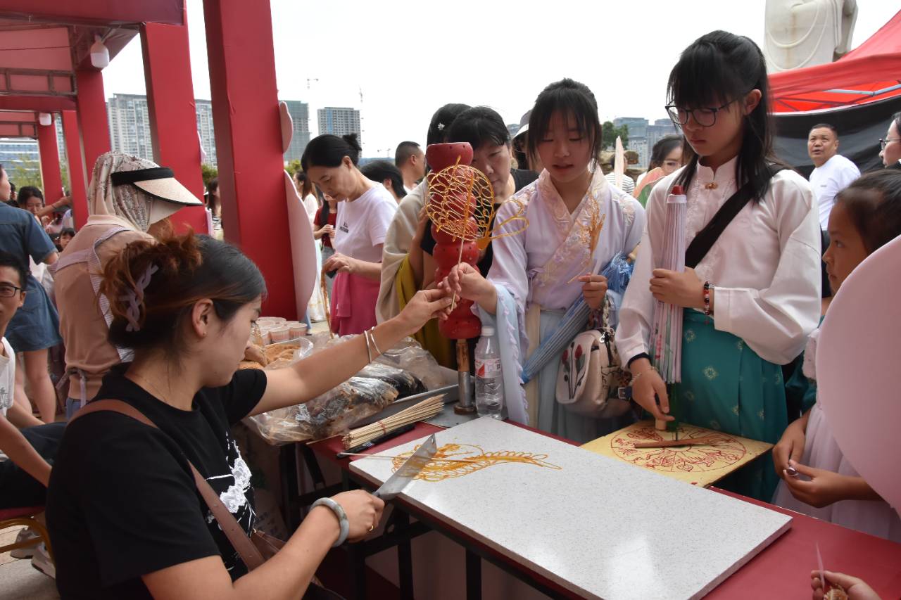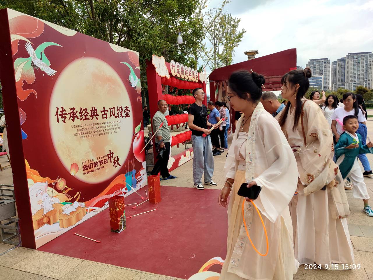 漢服衣袂飄飄、大紅燈籠高掛。投壺、吃糖畫、做月餅、穿漢服……活動現(xiàn)場隨處可感受國風古韻之美。