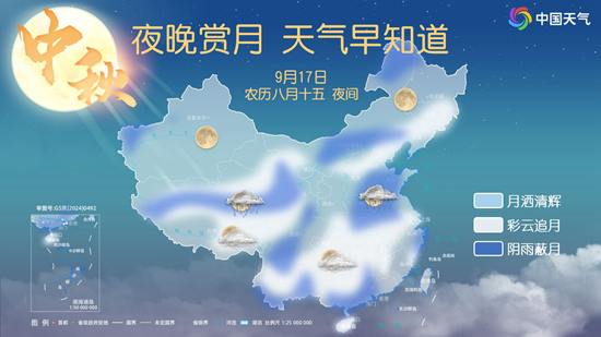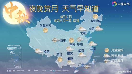 從2024全國中秋賞月地圖來看,9月17日夜間,新疆、甘肅西部、青海西部、西藏北部和南部、陜西、內(nèi)蒙古東部、黑龍江、福建、臺灣、廣東東部等地天氣條件較好,大部地區(qū)皓月當空,能夠看到月灑清輝的美景。