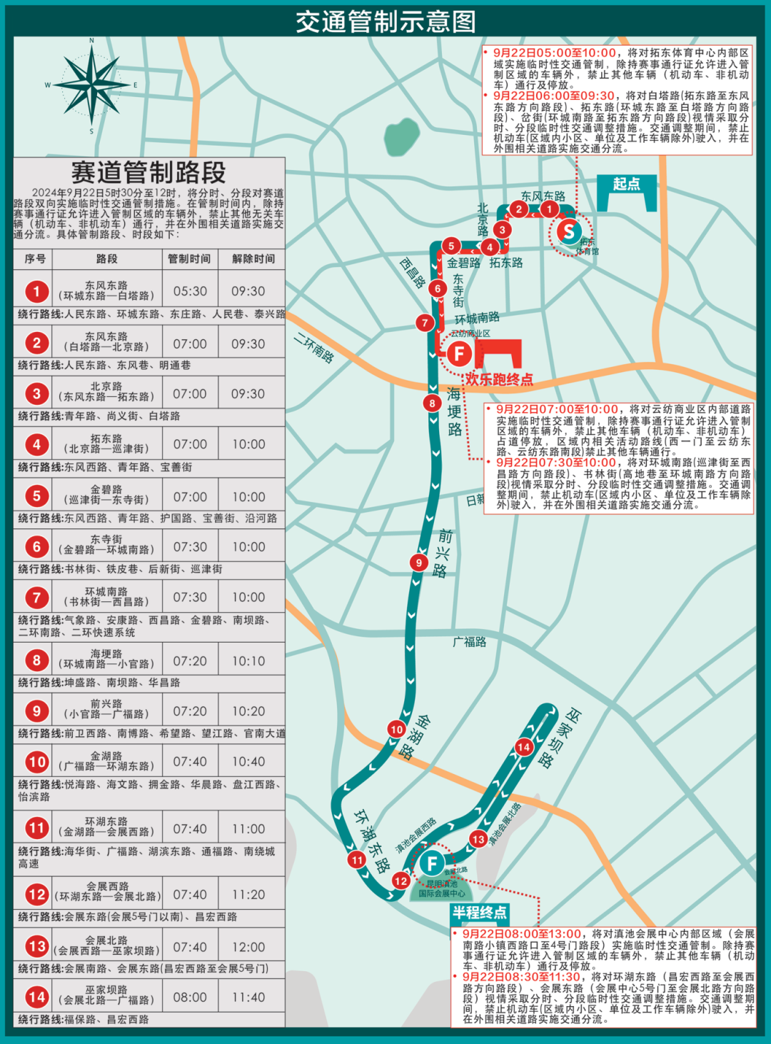 9月22日5:30至12:00,將分時、分段對賽道路段雙向?qū)嵤┡R時性交通管制措施。在管制時間內(nèi),除持賽事通行證允許進(jìn)入管制區(qū)域的車輛外,禁止其他無關(guān)車輛(機(jī)動車、非機(jī)動車)通行,并在外圍相關(guān)道路實(shí)施交通分流。具體管制路段、時段及繞行路線如下: