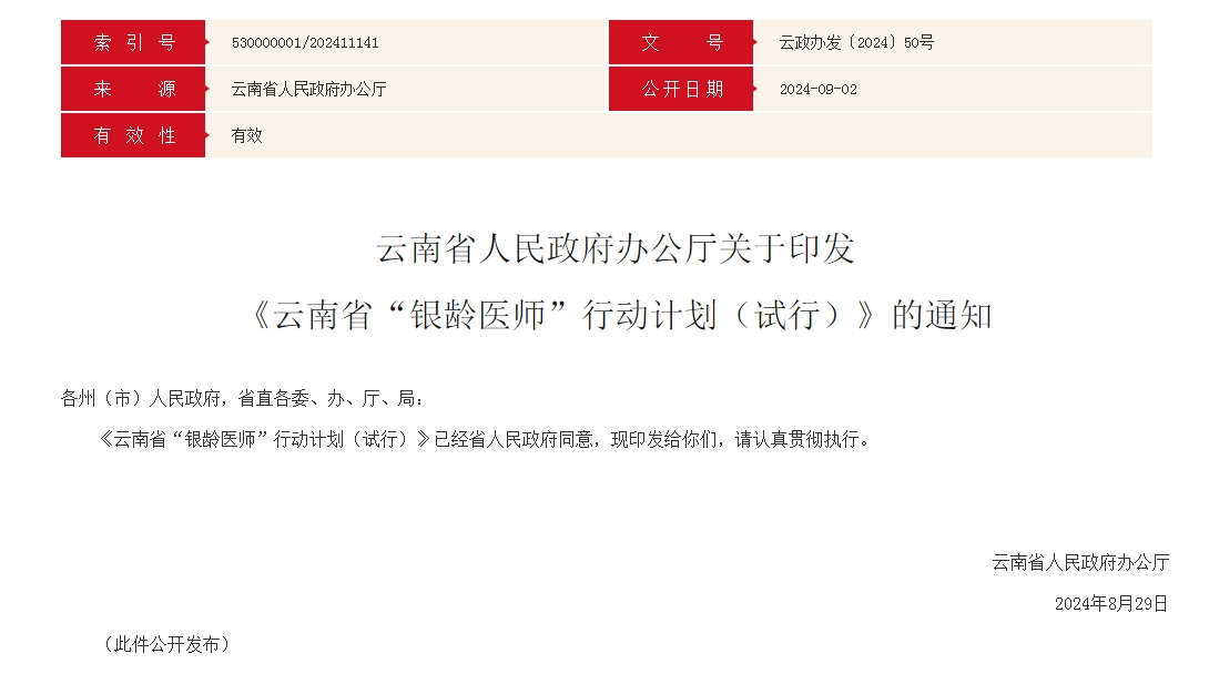 云南省“銀齡醫(yī)師”行動計劃(試行)