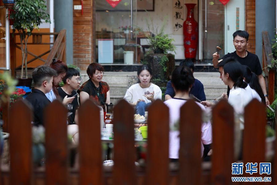 悅?cè)R居客棧老板婁正一(右一)和游客們(8月28日攝)。新華網(wǎng) 趙普凡 攝