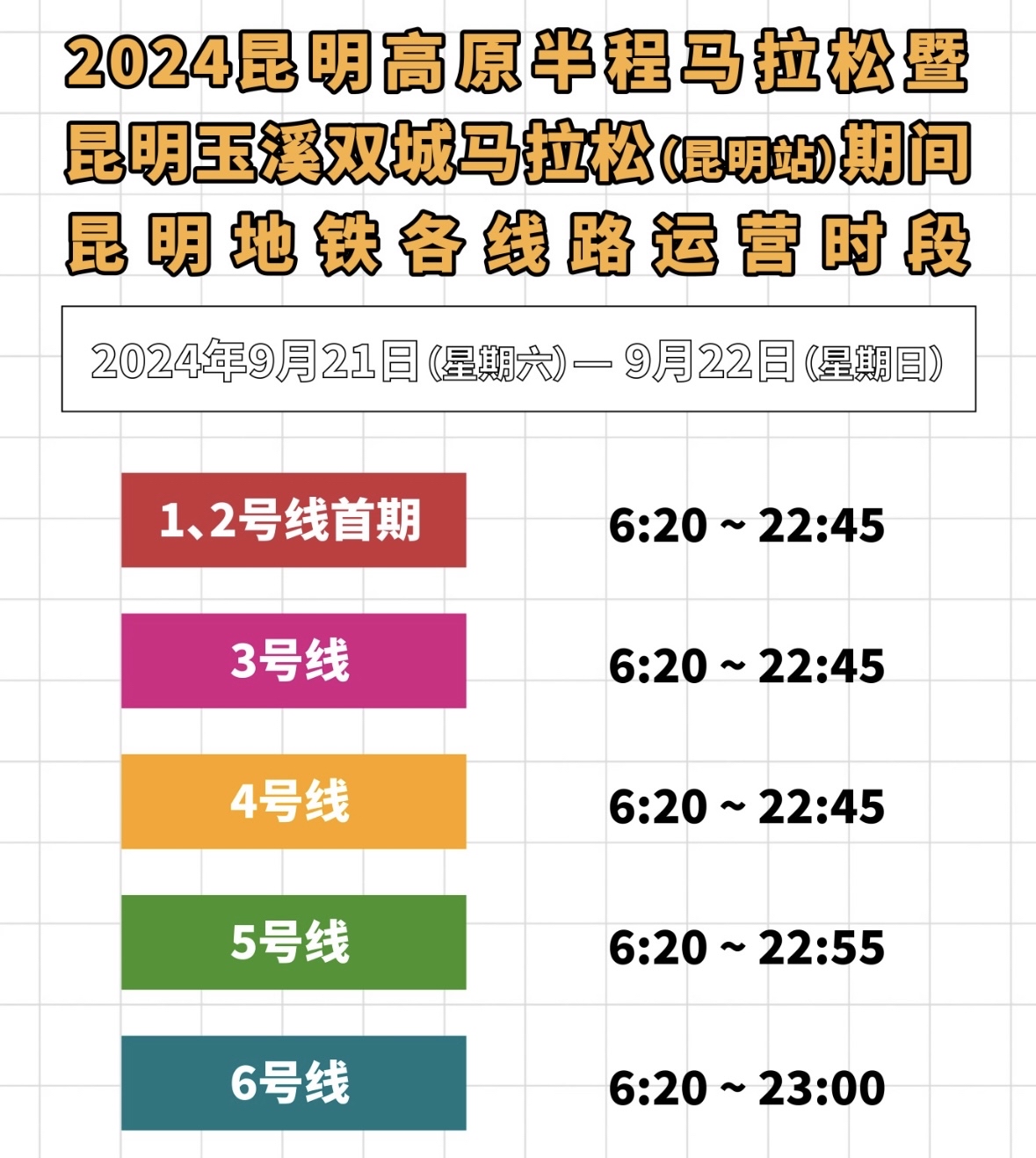 9月20日,記者從昆明軌道交通集團獲悉,2024昆明高原半程馬拉松暨昆明玉溪雙城馬拉松(昆明站)賽事期間,昆明地鐵全線網(wǎng)、全運營時段免費保障賽事期間安全快速便捷出行。