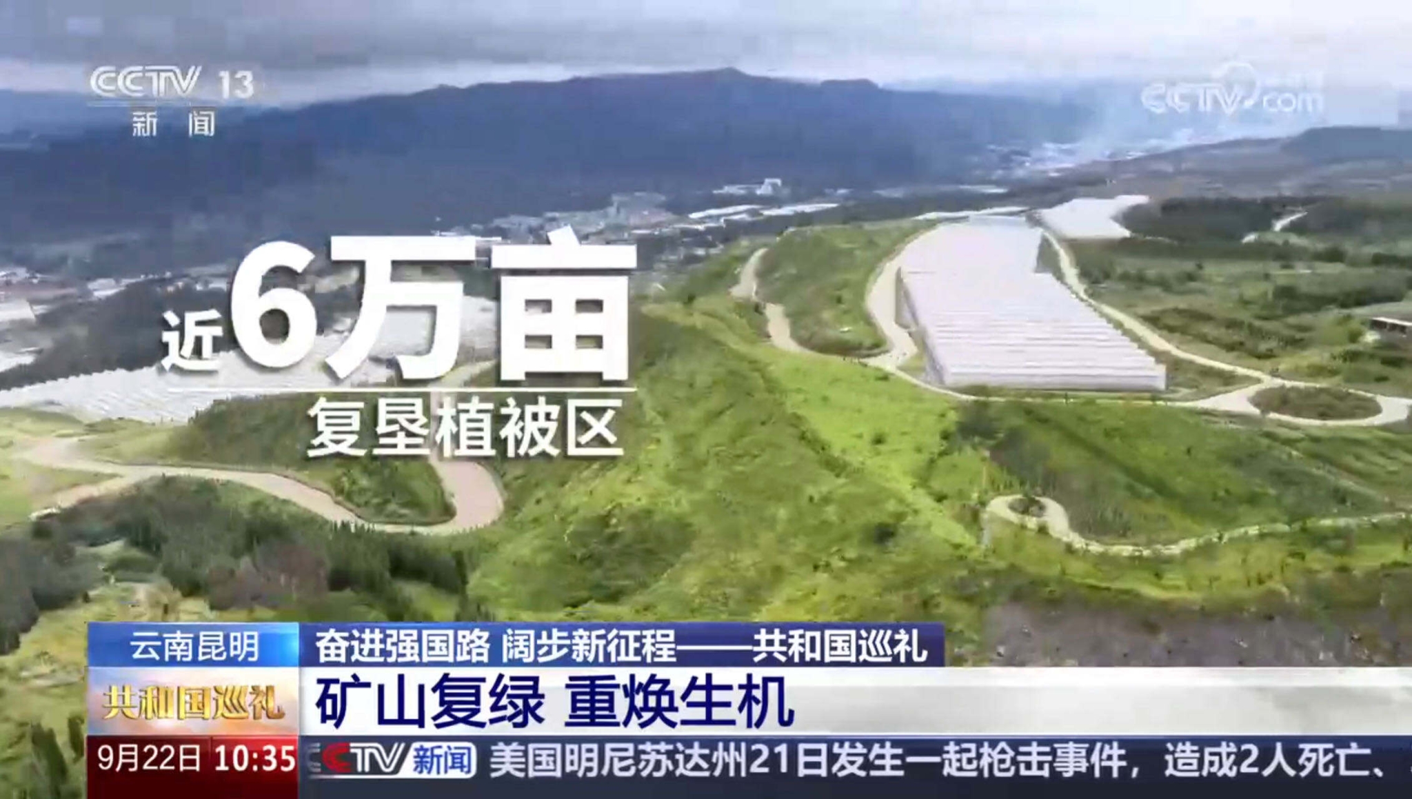為慶祝中華人民共和國成立75周年,中央廣播電視總臺(tái)于9月22日上午10:00—11:00,在央視CCTV-13新聞?lì)l道和央視新聞、央視頻等重點(diǎn)新媒體平臺(tái)同步推出融媒體特別節(jié)目《奮進(jìn)強(qiáng)國路 闊步新征程一一共和國巡禮》云南篇,全方位展示新中國成立后,尤其是黨的十八大以來,云南在建設(shè)我國民族團(tuán)結(jié)進(jìn)步示范區(qū)、生態(tài)文明建設(shè)排頭兵、面向南亞東南亞輻射中心等方面取得的重大成就。節(jié)目特別關(guān)注了昆明晉寧礦山復(fù)綠、重?zé)ㄉ鷻C(jī)的實(shí)踐與經(jīng)驗(yàn)。