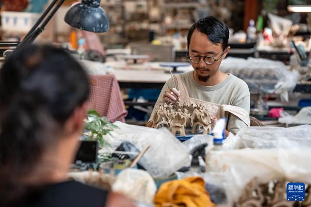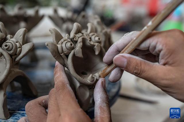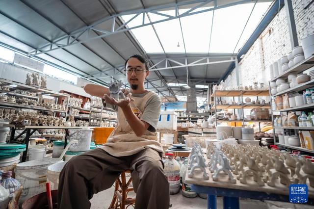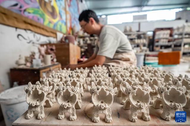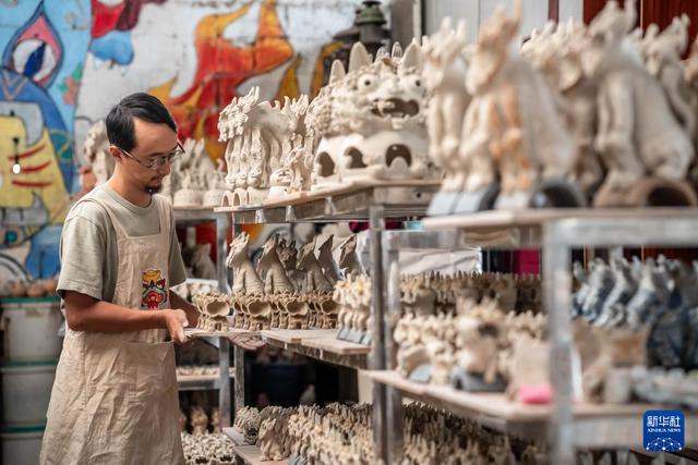 王子強(qiáng)在工作室內(nèi)制作瓦貓(9月18日攝)。