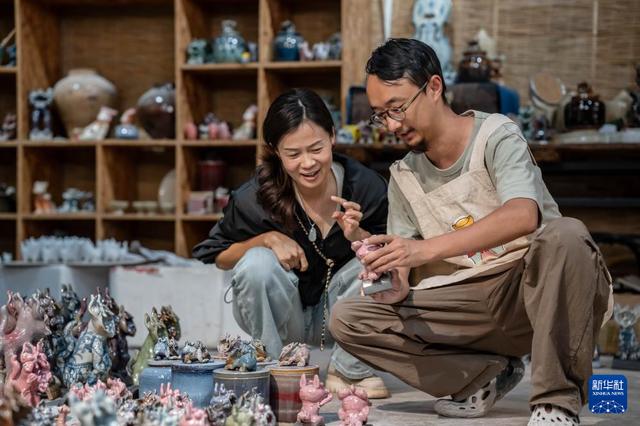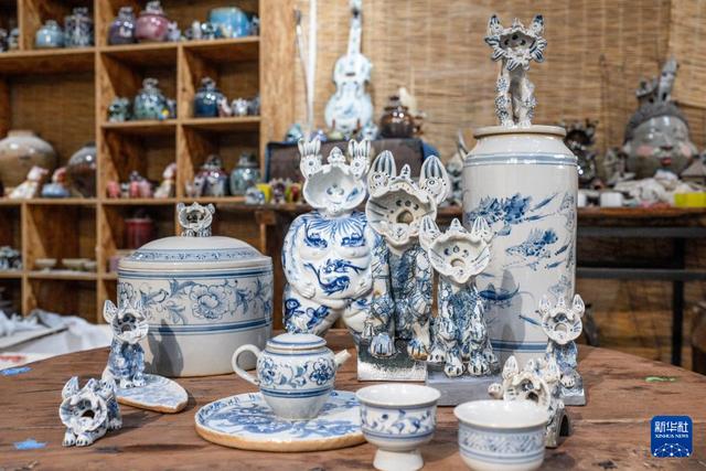 王子強(qiáng)制作的青花釉瓦貓(9月18日攝)。