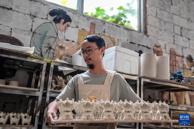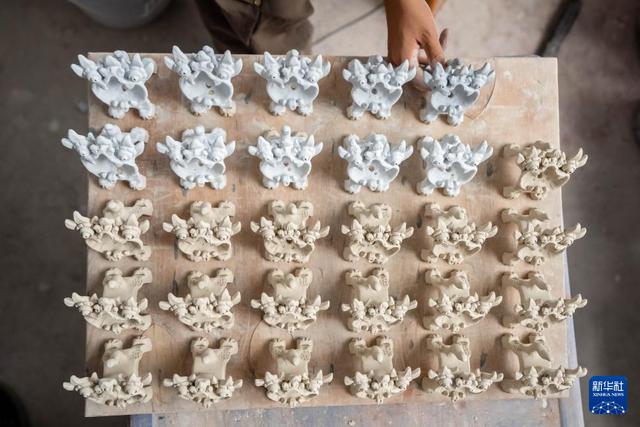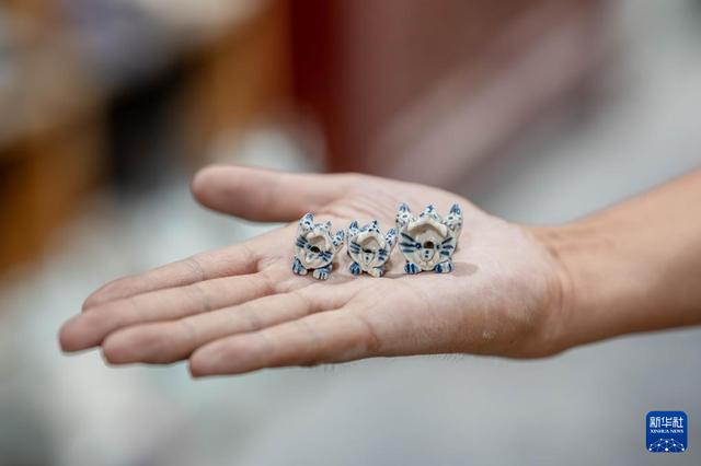 王子強(qiáng)制作的迷你款青花釉瓦貓(9月18日攝)。