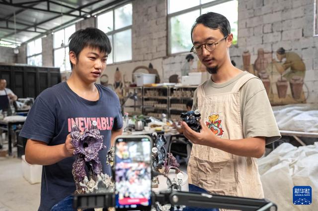 王子強(qiáng)(右)通過(guò)網(wǎng)絡(luò)直播推介瓦貓(9月18日攝)。