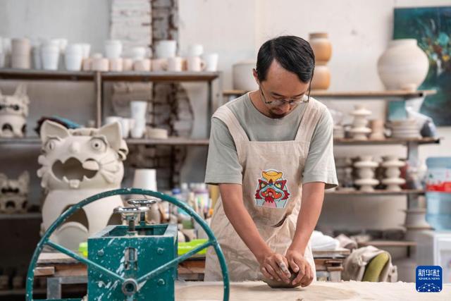 王子強(qiáng)在工作室內(nèi)制泥,準(zhǔn)備制作瓦貓(9月18日攝)。