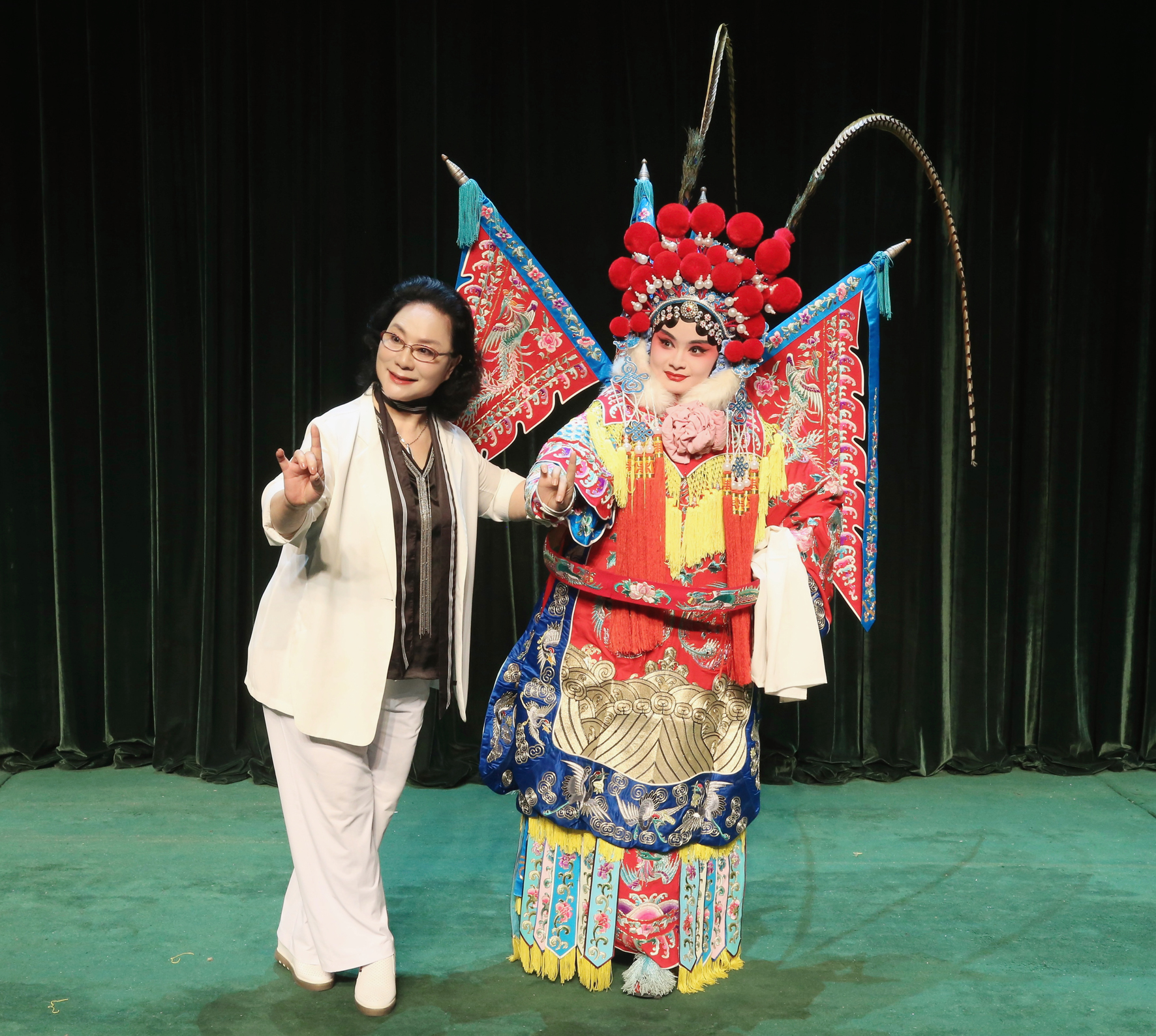 山東省京劇院表演藝術家鞠小蘇(左)在舞臺指導學生 山東省京劇院供圖