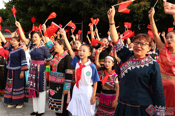 活動(dòng)結(jié)束時(shí),全場(chǎng)干部群眾揮舞國(guó)旗,同聲齊唱《歌唱祖國(guó)》。