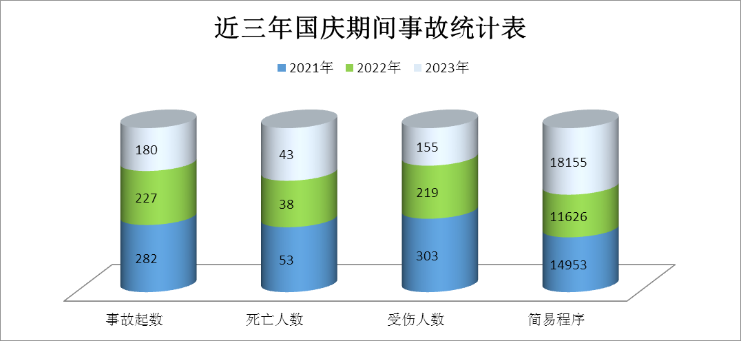 近三年國慶假期,全省平均發(fā)生一般程序處理的道路交通事故230起,平均發(fā)生簡(jiǎn)易程序處理的交通事故14911起。其中,2021年、2022年、2023分別發(fā)生交通事故282起、227起、180起。從簡(jiǎn)易程序處理的道路交通事故情況看,近3年分別發(fā)生交通事故14953起、11626起、18155起(如圖1所示)。