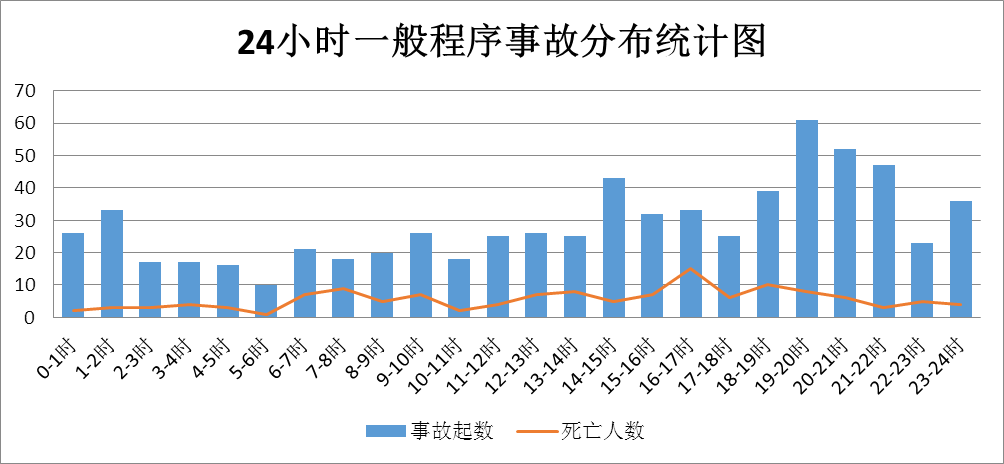 近三年國慶假期全省國慶假期交通事故主要呈現(xiàn)的規(guī)律特點(diǎn)分析如下:(一)節(jié)日第一、二天和節(jié)前一天事故高發(fā),晚間事故較為集中。國慶假期頭兩天和節(jié)前一天出行集中,事故相對(duì)較多。(如圖2、圖3所示)。從交通事故24小時(shí)分布情況看,14時(shí)至15時(shí)、18時(shí)至22時(shí)事故高發(fā),發(fā)生的一般程序事故占到總量的35.12%(如圖4所示)。