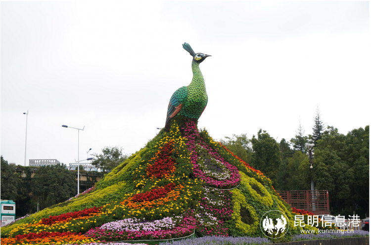 呈貢區(qū)除傳統的道路擺花外,在斗南花市片區(qū)及金桂街沿線小游園打造新的城市擺花點和道路景觀;在瑞香西街和興呈路交叉口擺放云南特有綠孔雀立體花壇,造型靈動、主題突出、色彩豐富;在和諧路與錦繡大街交叉口布置“開放昆明,歡度國慶”主題斜面花墻。