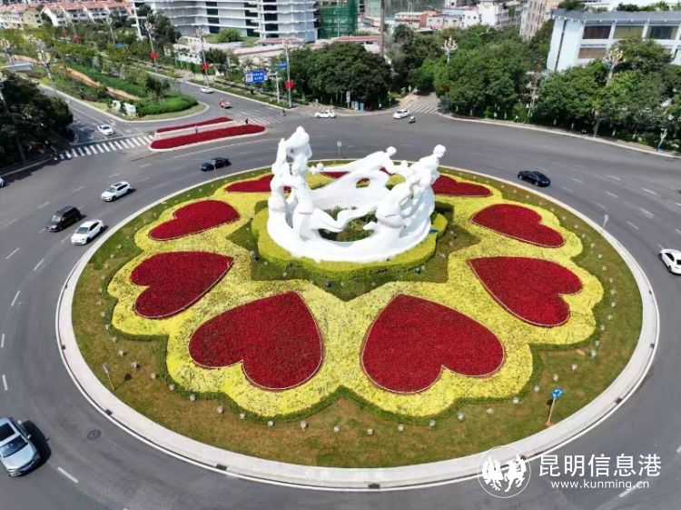 度假區(qū)在滇池路七公里轉盤綠地民族團結的雕塑周邊布置以“萬眾一心”為主題,紅、黃為主色調的心形模紋花壇,象征著各族人民團結一心、共同奮斗,營造熱烈而莊重的國慶氛圍;西海路沿線小游園及時更換時令花卉,優(yōu)化道路景觀效果。