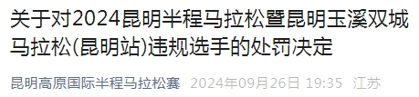 依照《2024昆明半程馬拉松暨昆明玉溪雙城馬拉松(昆明站)競賽規(guī)程》第十一條處罰辦法相關(guān)規(guī)定,給予A11135號選手路某如下處罰: