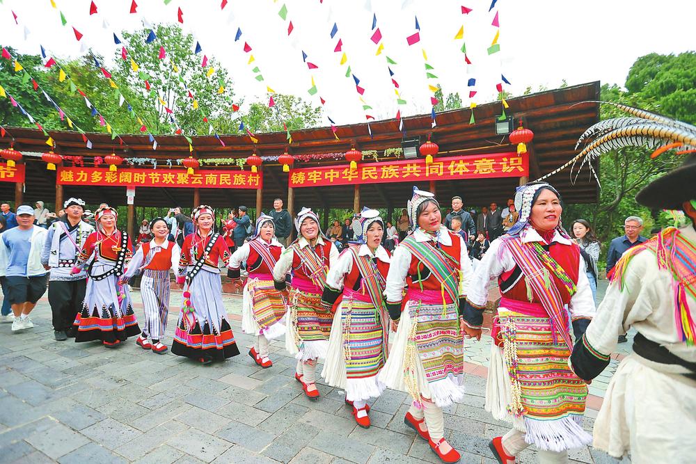 10月2日,云南民族村到處歡聲笑語,傈僳族同胞身著盛裝和游客載歌載舞共慶國慶。本報(bào)記者 陳飛 攝