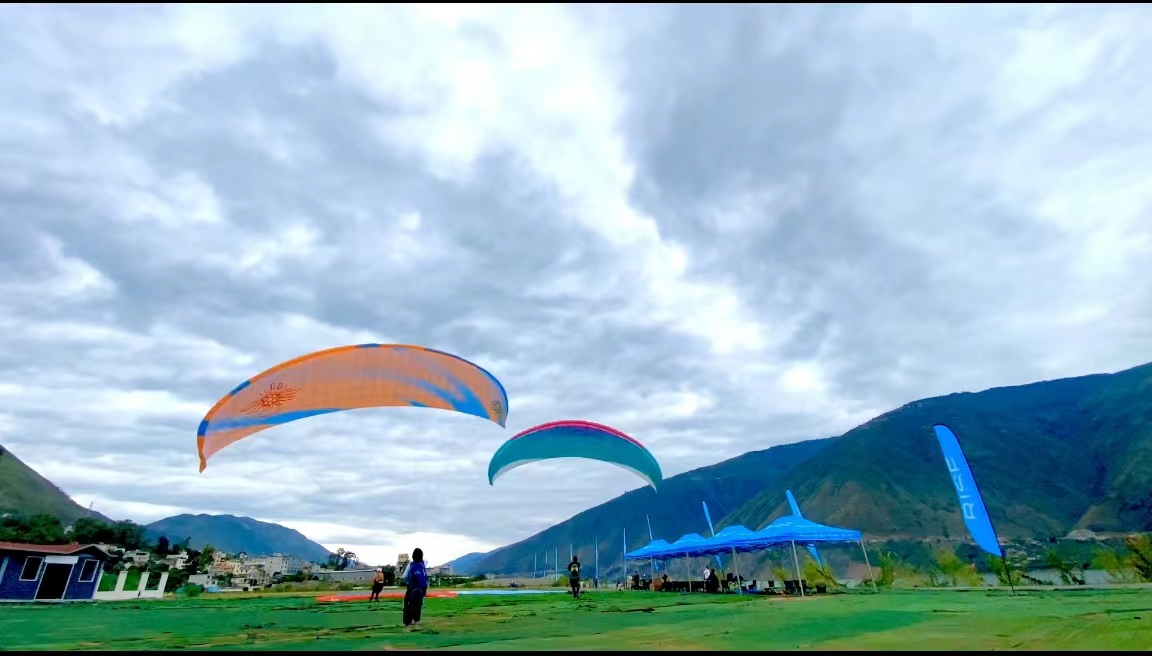 特技表演后,全體學員們帶上裝備乘車到達大朵起飛點,在教練的指導下,助跑、起飛、盤旋......一架架滑翔傘輕柔地翱翔在藍天白云之間,與風嬉戲、與鳥共舞,彰顯浪漫與自由。