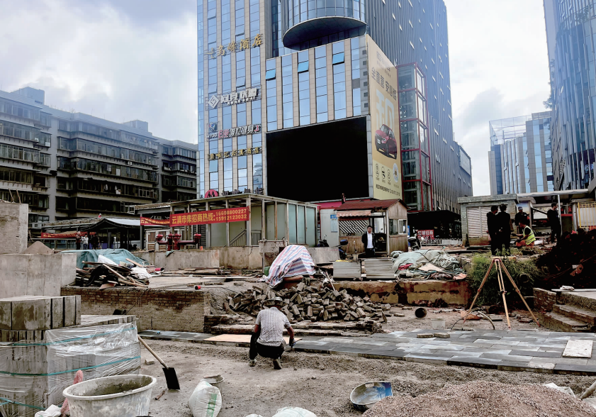 16日上午11點(diǎn),西山區(qū)福景路與滇池路交叉口車來車往,此前圍擋占據(jù)了福景路三分之二,僅夠行人和電動(dòng)車通行,圍擋拆除后,道路恢復(fù)車輛正常通行?,F(xiàn)場(chǎng)靠滇池時(shí)代一側(cè)的空地上,堆著許多建筑材料,幾名工人正在鋪設(shè)人行道地磚,還有一臺(tái)挖掘機(jī)在作業(yè)。人行道旁,地鐵站出入口主體結(jié)構(gòu)已經(jīng)完成。