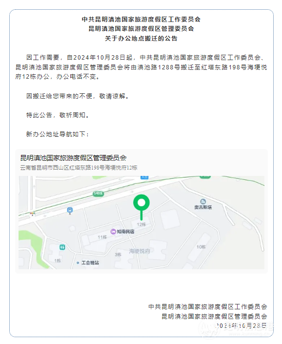 昆明信息港訊 記者楊雁 因工作需要,自2024年10月28日起,中共昆明滇池國(guó)家旅游度假區(qū)工作委員會(huì)、昆明滇池國(guó)家旅游度假區(qū)管理委員會(huì)將由滇池路1288號(hào)搬遷至紅塔東路198號(hào)海埂悅府12棟辦公,辦公電話不變。