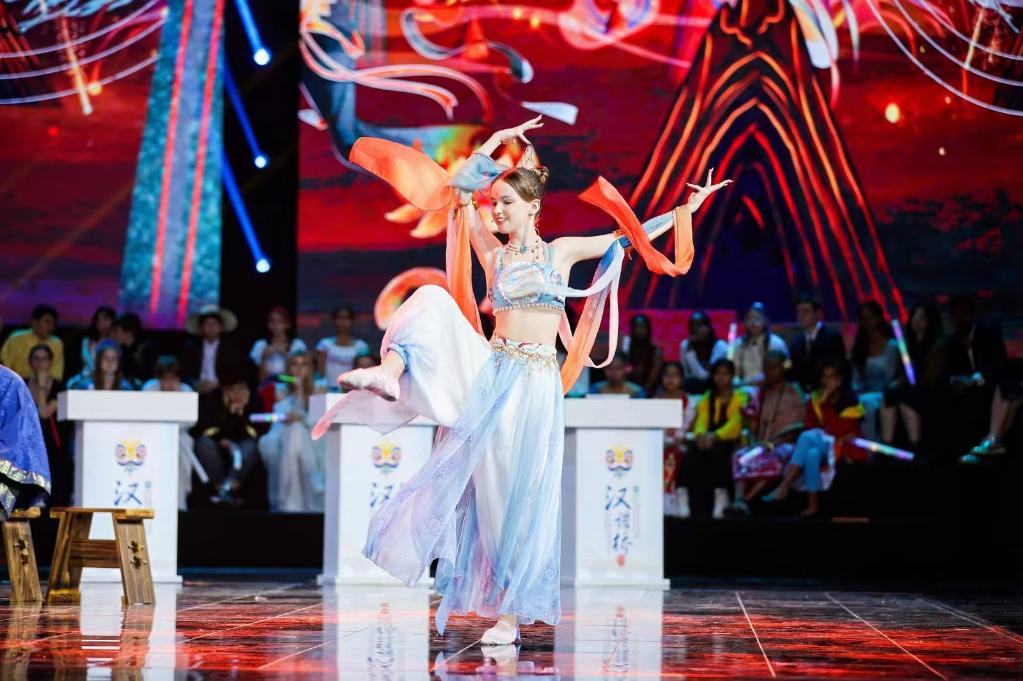 10月28日,第十七屆“漢語(yǔ)橋”世界中學(xué)生中文比賽選手在臺(tái)上展示才藝。新華社發(fā)