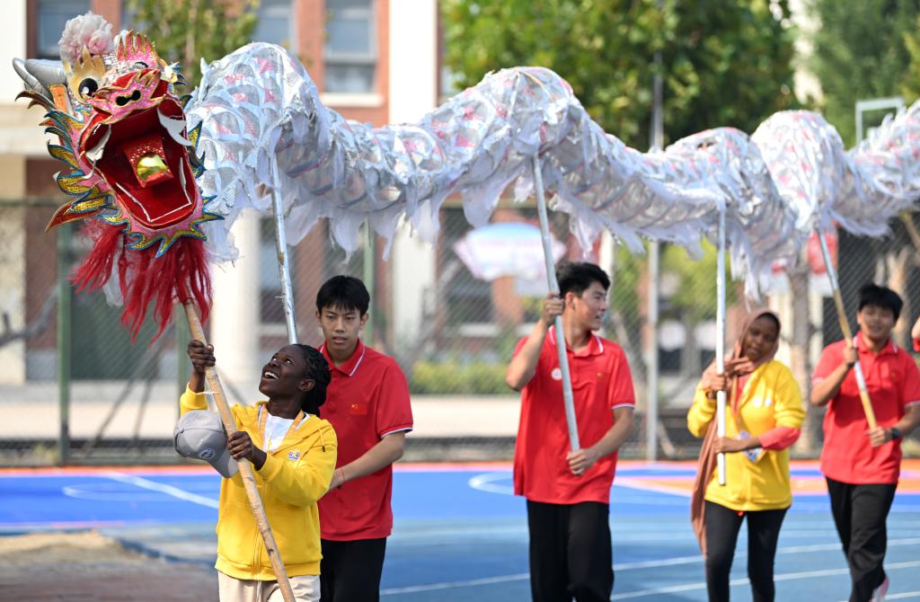 10月25日,“漢語(yǔ)橋”選手在天津霍元甲學(xué)校的操場(chǎng)上學(xué)習(xí)舞龍。新華社記者 李然 攝