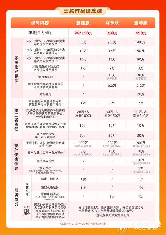 據(jù)介紹,2025年“彩云安居?!庇扇吮X?cái)險(xiǎn)、平安財(cái)險(xiǎn)、國壽財(cái)險(xiǎn)、太保財(cái)險(xiǎn)、誠泰財(cái)險(xiǎn)、太平財(cái)險(xiǎn)、大地財(cái)險(xiǎn)、大家財(cái)險(xiǎn)、華安財(cái)險(xiǎn)、中銀保險(xiǎn)、陽光財(cái)險(xiǎn)、永安財(cái)險(xiǎn)、國任財(cái)險(xiǎn)13家保險(xiǎn)公司共同承保的普惠服務(wù)型家庭綜合保險(xiǎn)。該保險(xiǎn)產(chǎn)品是貫徹落實(shí)國家金融監(jiān)管總局《關(guān)于加強(qiáng)新市民金融服務(wù)工作的通知》要求,遵循“廣覆蓋、普惠性、市場化、可持續(xù)”的基本原則,涵蓋房屋財(cái)產(chǎn)損失、人身意外、第三者責(zé)任以及居家服務(wù)等保障,區(qū)別于傳統(tǒng)家財(cái)險(xiǎn),“彩云安居?!币约彝ヘ?cái)產(chǎn)保障為基礎(chǔ),擴(kuò)展保障居家生活中的日常風(fēng)險(xiǎn)。如家庭財(cái)產(chǎn)損失、人身意外,以及因管道破裂、高空墜物造成的第三者責(zé)任,還提供居家生活服務(wù)。