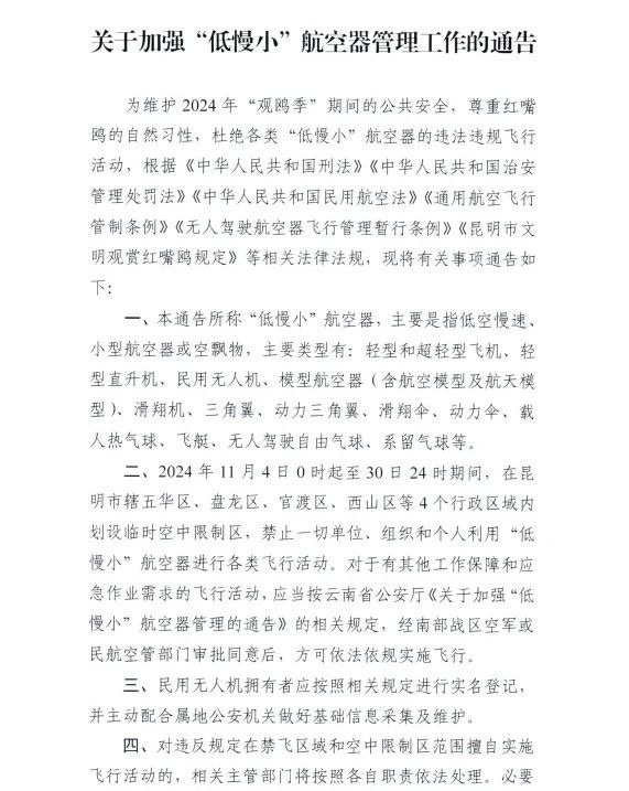 11月4日至30日期間,在昆明市轄五華區(qū)、盤龍區(qū)、官渡區(qū)、西山區(qū)等4個(gè)行政區(qū)域內(nèi)劃設(shè)臨時(shí)空中限制區(qū),禁止一切單位、組織和個(gè)人利用“低慢小”航空器進(jìn)行各類飛行活動(dòng)。對(duì)于有其他工作保障和應(yīng)急作業(yè)需求的飛行活動(dòng),應(yīng)當(dāng)按云南省公安廳《關(guān)于加強(qiáng)“低慢小”航空器管理的通告》的相關(guān)規(guī)定,經(jīng)南部戰(zhàn)區(qū)空軍或民航空管部門審批同意后,方可依法依規(guī)實(shí)施飛行。