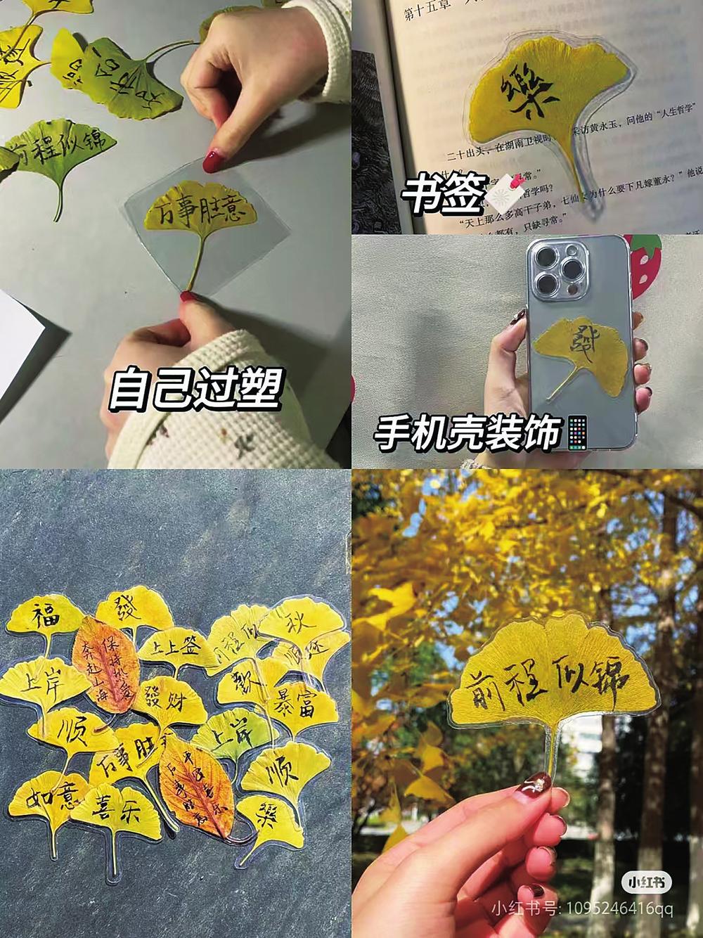 過塑的銀杏葉,既能做書簽,又能裝飾手機(jī)殼。