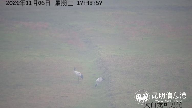 昆明信息港訊 記者任丹 通訊員范雷 陰雨綿綿,氣溫驟降,2024年11月6日17時49分,尋甸黑頸鶴保護區(qū)工作人員通過視頻監(jiān)控系統(tǒng)監(jiān)測到2只黑頸鶴飛臨尋甸黑頸鶴保護區(qū)大白龍海子悠閑覓食,標志著國家一級重點保護野生動物黑頸鶴在我國最南端越冬地的“越冬之旅”正式開啟。