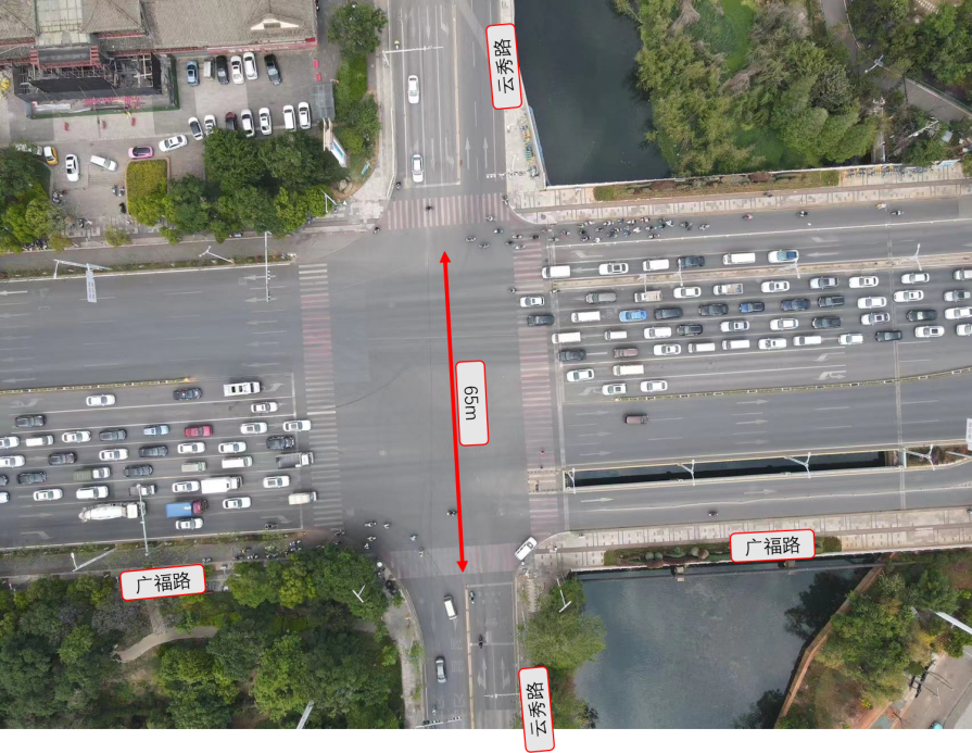 廣福路與云秀路交叉口位于昆明市官渡區(qū)廣福路中段,交叉口周邊業(yè)態(tài)豐富,擁有云南省博物館、官渡古鎮(zhèn)、官渡區(qū)第一中學等景點、教育地塊集中,交通吸引量大,交叉口運行壓力大。