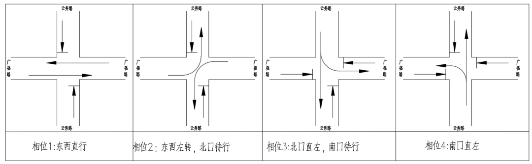 云秀路方向為南北方向直行、左轉混合放行,左轉非機動車與直行機動車、左轉車輛與直行車車輛交織。