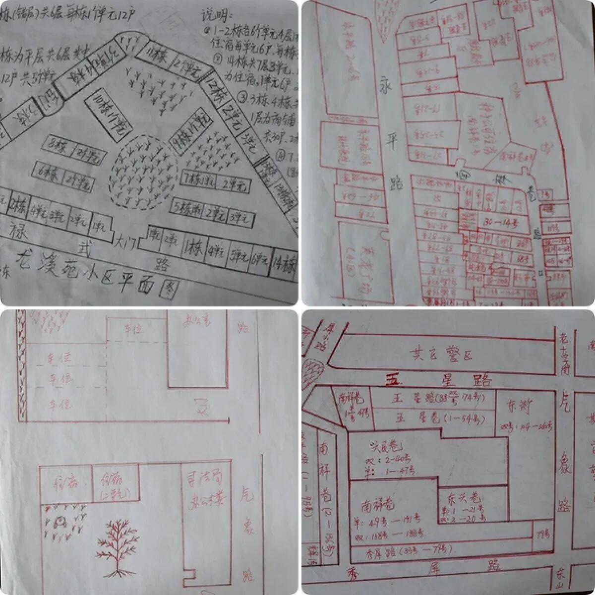白天,董順芬進(jìn)村走訪時便詳細(xì)記錄每家每戶的地理位置,晚上將記錄到的信息落于紙上,一張張手繪的轄區(qū)網(wǎng)格地圖上,密密麻麻地標(biāo)注著每一個門牌號碼、每一處場所單位、每一家沿街商戶……許多連衛(wèi)星地圖都查詢不到的坐標(biāo),在她的地圖上一目了然。