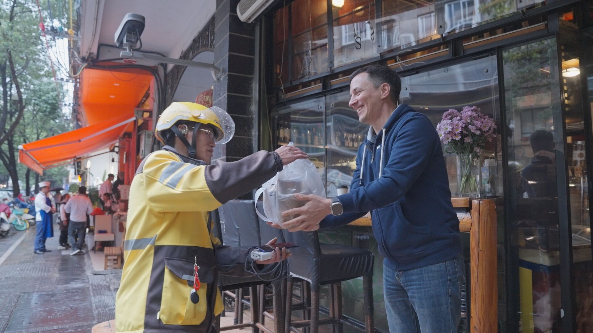 “想讓更多人知道我的店,也希望無(wú)法到店的客人可以品嘗我們的咖啡和甜點(diǎn)?!弊鳛樾律碳液屯鈬?guó)人,李京勛遇到不少疑惑?!白o(hù)照怎么上傳信息”“系統(tǒng)怎么操作”“怎么提現(xiàn)”……一遇到問(wèn)題,李京勛就第一時(shí)間聯(lián)系“小幫手”,快速完成了信息注冊(cè)和審核工作,于今年3月成功入駐外賣平臺(tái)。