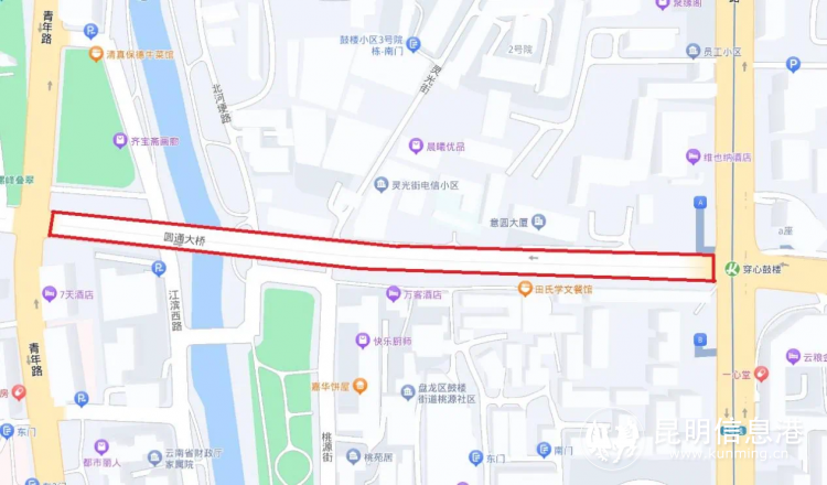 因圓通大橋封閉,橋上過往車輛經(jīng)鼓樓路或人民中路進行繞行,橋下車輛可通過江濱西路或靈光街與桃源街繞行。