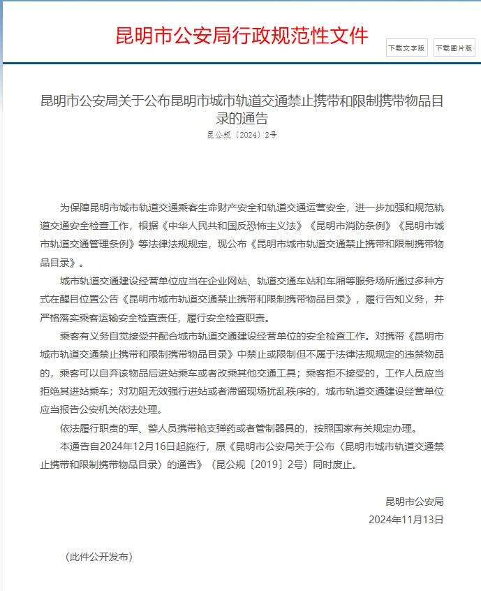 據(jù)文件顯示,通告自2024年12月16日起施行,原《昆明市公安局關(guān)于公布〈昆明市城市軌道交通禁止攜帶和限制攜帶物品目錄〉的通告》(昆公規(guī)〔2019〕2號(hào))同時(shí)廢止。