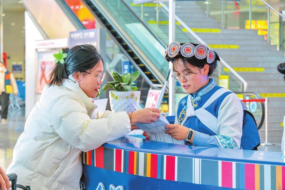 為全面提升乘客的出行體驗(yàn),國(guó)鐵昆明局科學(xué)分析旅客出行規(guī)律,精準(zhǔn)投放運(yùn)力資源,豐富客運(yùn)產(chǎn)品供給,提供更加安全、綠色、高效、舒適的出行方式,較好地滿足了民族地區(qū)人民求學(xué)、探親、旅游、商貿(mào)等出行需求。通過(guò)打造“扎西食集”主題餐吧,創(chuàng)建“玉龍·金花”“香巴拉·金花”等服務(wù)品牌,推出“漢語(yǔ)+民族語(yǔ)+英語(yǔ)”三語(yǔ)服務(wù),為老弱病殘?jiān)械戎攸c(diǎn)旅客提供“一站式”出行服務(wù),全力保障旅客出行無(wú)憂。當(dāng)?shù)亟煌ㄟ\(yùn)輸部門制定推出了車站到景區(qū)的直達(dá)客運(yùn)專線,解決乘車出行“最后一公里”問(wèn)題。