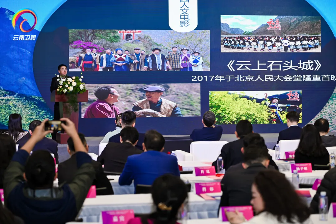 云南文化產(chǎn)業(yè)招商引資推介會(huì)現(xiàn)場(chǎng),寶山鄉(xiāng)黨委副書(shū)記、鄉(xiāng)長(zhǎng)宋德邏作推介。(圖源:云南衛(wèi)視)