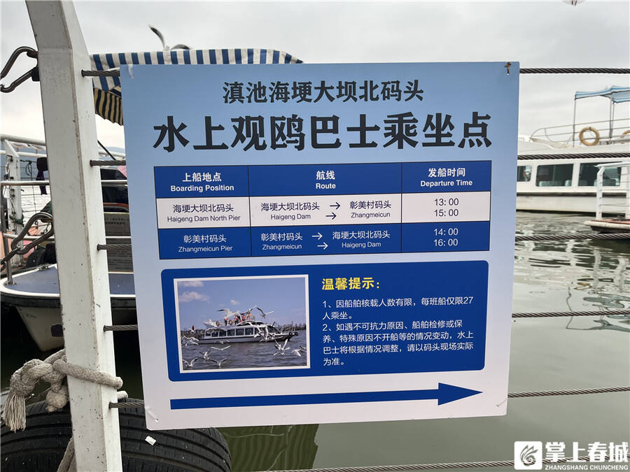 據(jù)運營中心鐘姓工作人員介紹,“水上觀鷗巴士” 每天4趟,其中海埂大壩北碼頭于13點和15點開船,彰美村碼頭則為14點、16點間開船,單程行駛時常30分鐘左右,每班船承載量為27人。