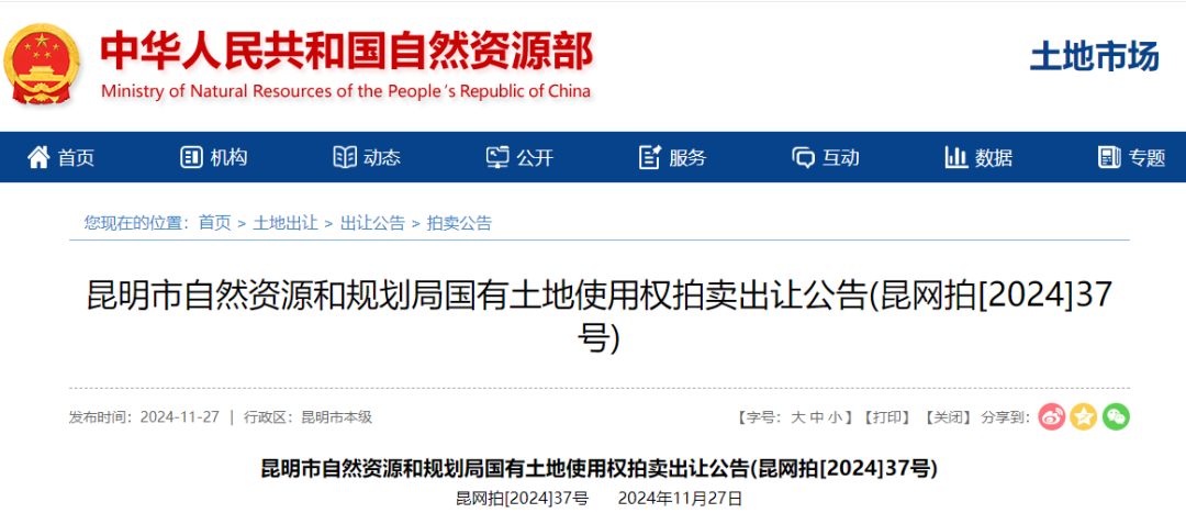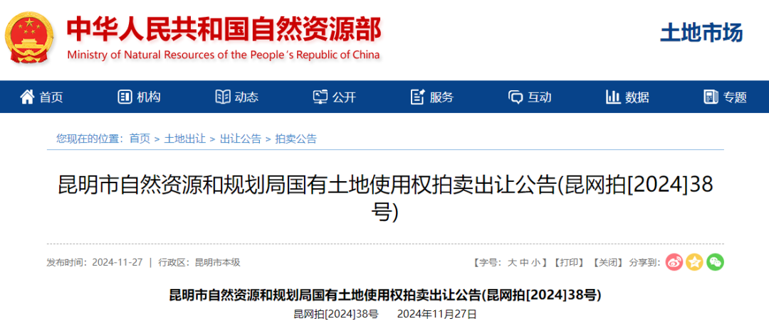 11月27日,自然資源部發(fā)布了兩則“昆明市自然資源和規(guī)劃局國(guó)有土地使用權(quán)拍賣(mài)出讓公告(昆網(wǎng)拍[2024]37號(hào))、(昆網(wǎng)拍[2024]38號(hào))”,內(nèi)容顯示官渡區(qū)共有13宗土地的使用權(quán)將于12月18日集中拍賣(mài),其總面積為335111.53平方米,約502畝,起拍總價(jià)約為29億元。