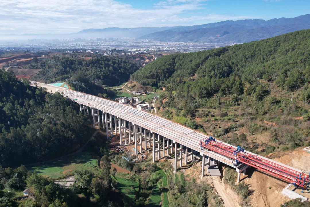11月26日,楚雄市東南繞城高速田房頭大橋T梁架設(shè)完成。