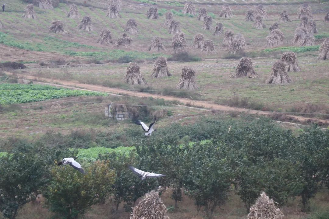在碧凹村的田間地頭,優(yōu)雅的黑頸鶴怡然自得,或悠閑漫步,或?qū)W⒁捠?,或振翅翱翔。它們與田間勞作的村民相互映襯,勾勒出了一幅人與自然和諧共生的絕美畫(huà)卷。據(jù)馬敏龍介紹,黑頸鶴會(huì)在每年農(nóng)歷十月份左右飛來(lái),要到第二年農(nóng)歷三月份才會(huì)遷徙離開(kāi)。