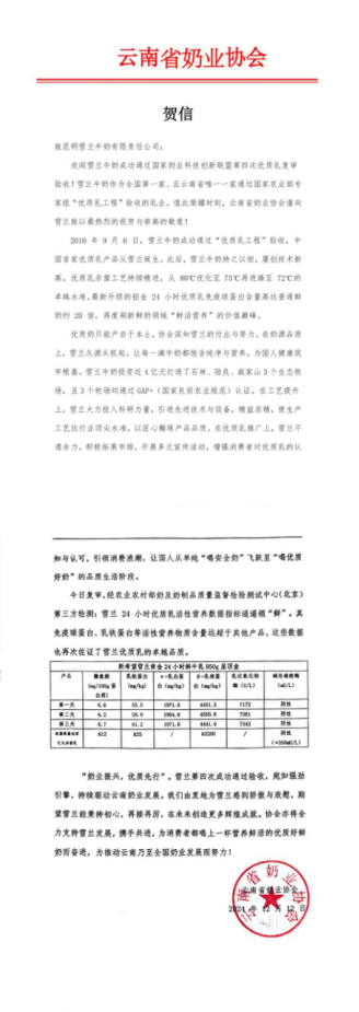 雪蘭牛奶第四次優(yōu)質(zhì)乳驗(yàn)收通過(guò)后,云南省奶業(yè)協(xié)會(huì)發(fā)來(lái)賀信