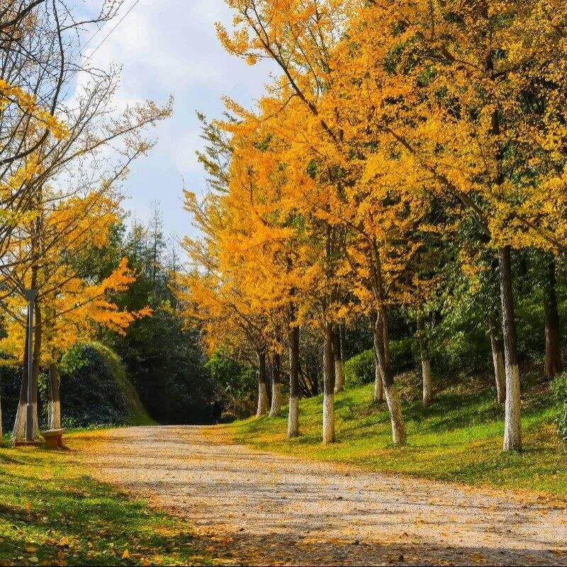 洛龍公園中的長(zhǎng)椅,在銀杏葉的簇?fù)硐?,也增添了幾分浪漫與詩(shī)意。洛龍公園的銀杏林主要集中在龍珠山腳下,銀杏樹(shù)高大挺拔,整齊地排列在步行道一側(cè),長(zhǎng)長(zhǎng)的過(guò)道兩旁都排列著銀杏樹(shù),形成了一片壯觀(guān)的銀杏林,象征著堅(jiān)韌和長(zhǎng)壽。