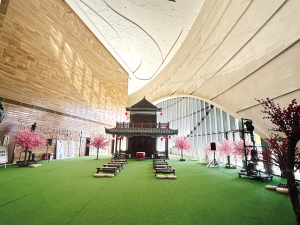 集萃苑總體設(shè)計(jì)為中式復(fù)古風(fēng)格,一面古典園林洞門(mén)墻作為入口,苑中放置仿真草地、竹林、花樹(shù)等置景,正中間配有古戲臺(tái)和荷花池,呈現(xiàn)出一個(gè)古色古香的“世外桃源”。古戲臺(tái)前的區(qū)域常設(shè)一琴、一箏、一鼓,古戲臺(tái)斜前方的兩側(cè)還配有專業(yè)的燈光、音響、話筒、調(diào)音等設(shè)備,每個(gè)進(jìn)入集萃苑的市民都可以用其進(jìn)行演奏,感受傳統(tǒng)民樂(lè)的魅力。入口右側(cè)的區(qū)域設(shè)有3個(gè)經(jīng)典書(shū)籍展示柜,放置有文學(xué)、藝術(shù)、兒童等國(guó)內(nèi)外諸多題材、種類的優(yōu)質(zhì)書(shū)籍,供市民免費(fèi)取閱;中心的空地放置了10張古式案桌,并配有24個(gè)草編蒲團(tuán),可供市民落座觀看演出、讀書(shū)、休憩。