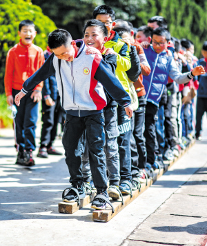 官渡區(qū)白漢場中心學校學生體驗壯族傳統(tǒng)體育項目“大板鞋”。 新華社