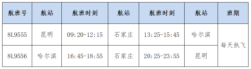 祥鵬航空本次復(fù)飛的昆明→石家莊→哈爾濱航線,采取每日一班的運(yùn)營(yíng)模式。具體航班信息為:去程航班號(hào)8L9555,計(jì)劃9:20自昆明起飛,12:15到達(dá)石家莊,短暫經(jīng)停后于13:25再次起飛,15:45抵達(dá)哈爾濱;返程航班號(hào)8L9556,計(jì)劃16:45自哈爾濱起飛,18:55到達(dá)石家莊,經(jīng)停后于20:25起飛,23:55抵達(dá)昆明。