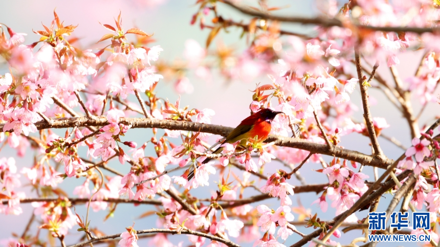小鳥停歇于冬櫻花枝頭(12月18日攝)。新華網(wǎng)發(fā)(施甸縣融媒體中心供圖)