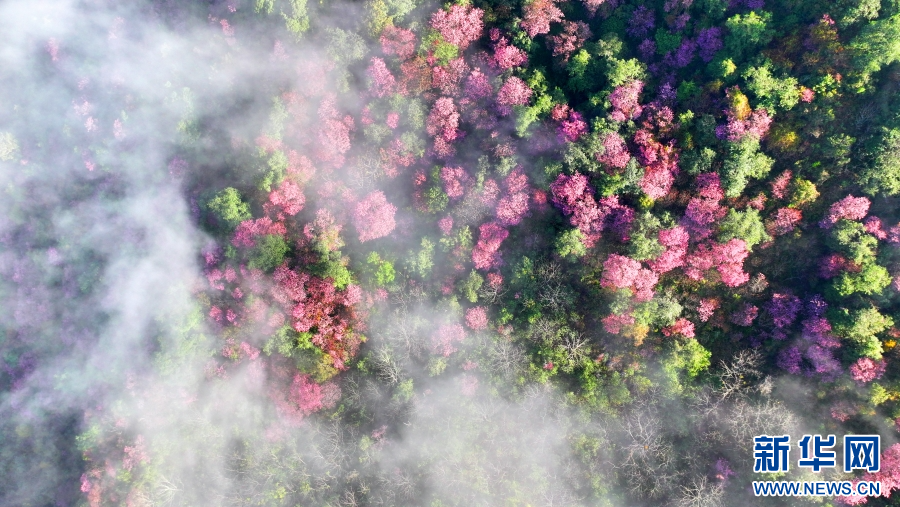 薄霧下盛開的冬櫻花(12月18日攝)。新華網(wǎng)發(fā)(施甸縣融媒體中心供圖)