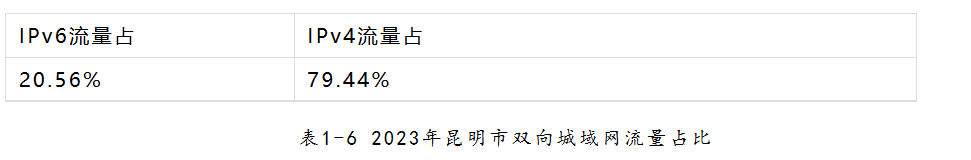 雙向城域網(wǎng)IPv6流量占昆明市城域網(wǎng)全部流量的20.56%。支持IPv6地址的家庭網(wǎng)關(guān)數(shù)量達(dá)到303.1萬個,家庭網(wǎng)關(guān)IPv6支持率達(dá)到98.1%。