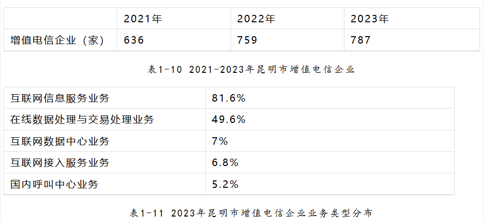 787家注冊地為昆明市的企業(yè)獲得增值電信業(yè)務(wù)許可(包含工信部及省通信管理局頒發(fā)),同比增加3.7%,占全省的比重為71.4%。其中81.6%從事互聯(lián)網(wǎng)信息服務(wù)業(yè)務(wù),49.6%從事在線數(shù)據(jù)處理與交易處理業(yè)務(wù),7%從事互聯(lián)網(wǎng)數(shù)據(jù)中心業(yè)務(wù),6.8%從事互聯(lián)網(wǎng)接入服務(wù)業(yè)務(wù),5.2%從事國內(nèi)呼叫中心業(yè)務(wù)。